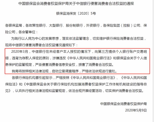 “5号文”显示,2020年3月,中信银行在未经客户本人授权的情况下,向第三方提供个人银行账户交易明细,违背为存款人保密的原则,涉嫌违反《中华人民共和国商业银行法》和银保监会关于个人信息保护的监管规定,严重侵害消费者信息安全权,损害了消费者合法权益。中国银保监会消费者权益保护局将按照相关法律法规,启动立案调查程序,严格依法依规进行查处。“5号文”强调,各银行保险机构要引起警示,严格按照《中华人民共和国商业银行法》、《中华人民共和国保险法》和《中国银保监会关于银行保险机构加强消费者权益保护工作体制机制建设的指导意见》,认真执行相关法律法规和监管规定,依法合规开展经营活动,切实保护消费者合法权益。