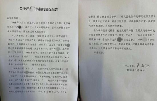 在这份署名为严春风的报告中这样写道:严春风对此次事件毫不知情,幼儿园没有任何老师被开除,“严某某妈妈”是其第二任妻子李向阳,两人于2011年结婚,育有一女,在2013年12月时因工作长期分居女方出轨而离婚,后未成年子女严某某随李向阳生活。