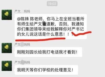 5月11日,有博主爆料,成都金苹果爱弥儿幼儿园班上有位女孩打同学,老师将她单独安排座位的决定误发到了家长群里。随后署名为“严某某妈妈”的家长在微信群里要求陈老师马上在全班当着所有师生给严某某道歉,并疾言厉色道“否则,我通知你们集团领导来给我解释你对严书记的女儿说这话是什么意思!”紧接着,“严某某妈妈”又称:陈老师已被学校开除。“严某某妈妈”还在群内炫耀,严某某已被四川嘉祥外国语学校录取,且为内定生。