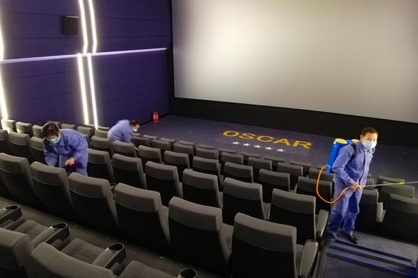5月12日,奥斯卡国际影城万锦城店工作人员在影厅内做消杀