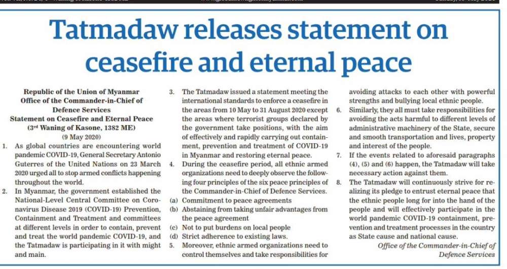 ● 缅甸国防军5月9日宣布,为了应对新冠疫情,也为了缅甸的永久和平,缅甸从5月10日至8月31日实施停火。详情