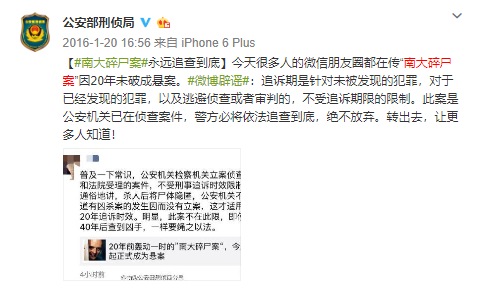 2016年1月,网上流传该案将过20年的追诉期,对此公安部刑侦局还曾发微博辟谣相关说法,表示将“依法追查到底”。