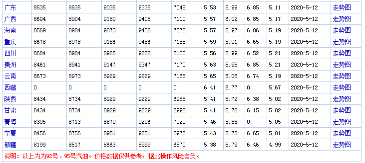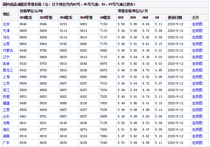 5月12日汽、柴油限价表;