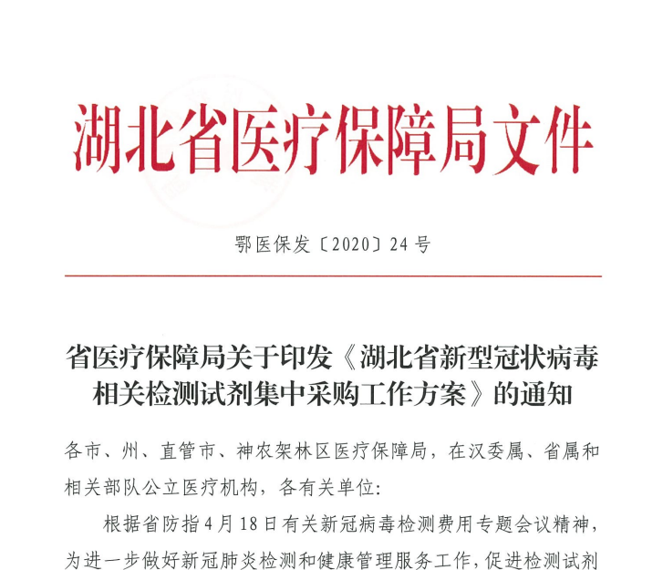 4月23日,湖北省医保局印发了关于《湖北省新型冠状病毒相关检测试剂集中采购工作方案》(下称《工作方案》)的通知。《工作方案》要求,湖北省辖区内相关医疗机构及第三方检测机构为采购主体,竞价规则为合格投标人按报价由低到高竞价入围,新冠病毒抗体检测试剂盒取报价最低前三家作为拟中选品种等。