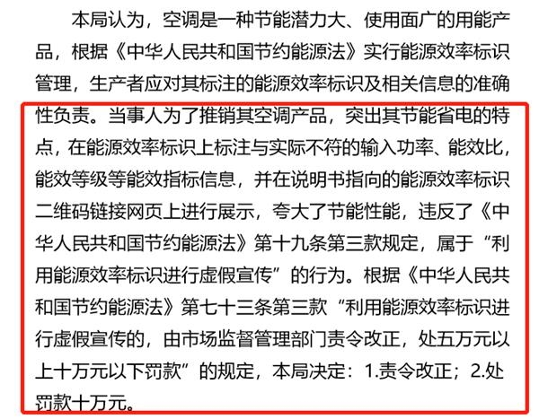而本次的处罚决定书也显示,对奥克斯KFR-35GW/ZC+2型号的空调进行检测发现,其能效比3.21,能效等级3级,与其能源效率标识上的信息不符,认定存在虚假宣传。