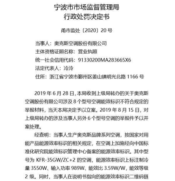 宁波市市场监督管理局对奥克斯的行政处罚决定书显示,2019年6月28日,宁波市市场监督管理局收到上级局转办的关于奥克斯空调股份有限公司涉及8个型号空调能效标识不符合规定的举报材料,当天决定予以立案。2019年8月15日,宁波市市场监督管理局对上级局转办的涉及奥克斯另外 6 个型号空调的举报件予以并案处理。