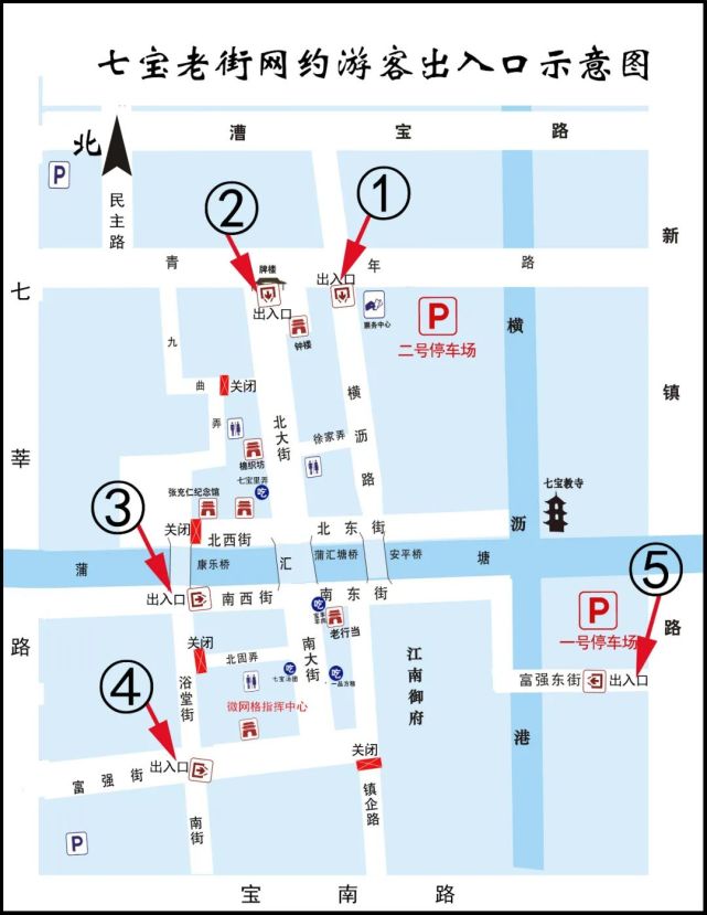 七宝老街网约游客出入口示意图。