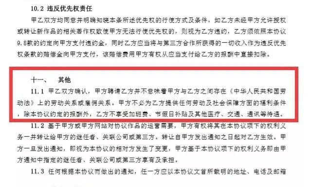 在新合同里,阅文聘请作者,但双方不存在劳动关系或雇佣关系,阅文不为作者提供劳动和社会保障方面的福利。