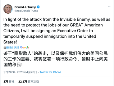 特朗普签署行政令暂停移民入美