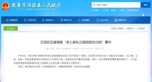 就近日陕西安康发生的78岁老汉被妇产医院接去住院一事,11日上午,安康市汉滨区政府发布通告称在征得患者家属同意的情况下,工作组迅速将患者李某某等8位老人相继转入汉滨区第一医院进行诊断治疗。相关情况正在进一步调查核实,调查结果将第一时间向社会通报。