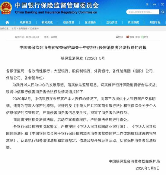 5月9日,银保监会消费者权益保护局发布的公告显示,2020年3月,中信银行在未经客户本人授权的情况下,向第三方提供个人银行账户交易明细,违背为存款人保密的原则,涉嫌违反《中华人民共和国商业银行法》和银保监会关于个人信息保护的监管规定,严重侵害消费者信息安全权,损害了消费者合法权益。我局将按照相关法律法规,启动立案调查程序,严格依法依规进行查处。