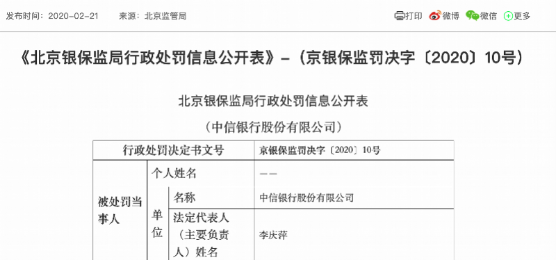 2019年8月9日,中国银保监会当日在官网挂出的行政处罚信息公开表显示,中信银行因存在未按规定提供报表且逾期未改正、错报、漏报银行业监管统计资料等十三项违法违规事实,被没收违法所得33.6677万元,罚款2190万元,合计2223.6677万元。
