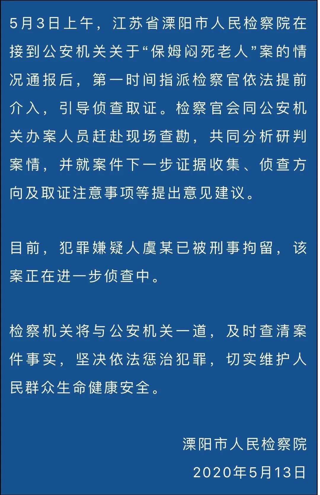 5月12日,江苏省溧阳市公安局就“保姆闷死83岁老人”发布通报称,涉案保姆虞某因涉嫌故意杀人罪被公安机关依法刑事拘留。