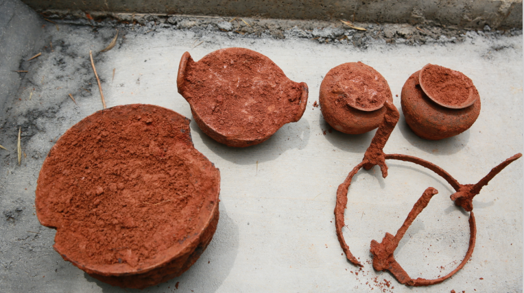 ▲在墓室北侧,发掘出了铁釜、铁盆、陶罐、支架等东汉时期生活用品文物。