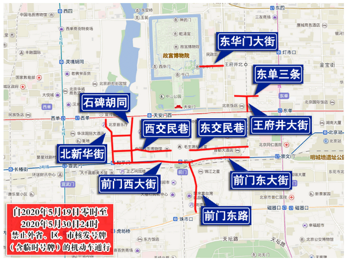 前门东大街(正义路至台基厂大街之间西向东辅路除外)、前门西大街、前门东路、北新华街、西交民巷、东交民巷(广场东侧路至台基厂大街段)、东绒线胡同、兵部洼胡同、石碑胡同、王府井大街(东长安街至东单三条段)、东单三条(王府井大街至校尉胡同段)、大纱帽胡同、东华门大街,禁止外省、区、市核发号牌(含临时号牌)的机动车通行。
