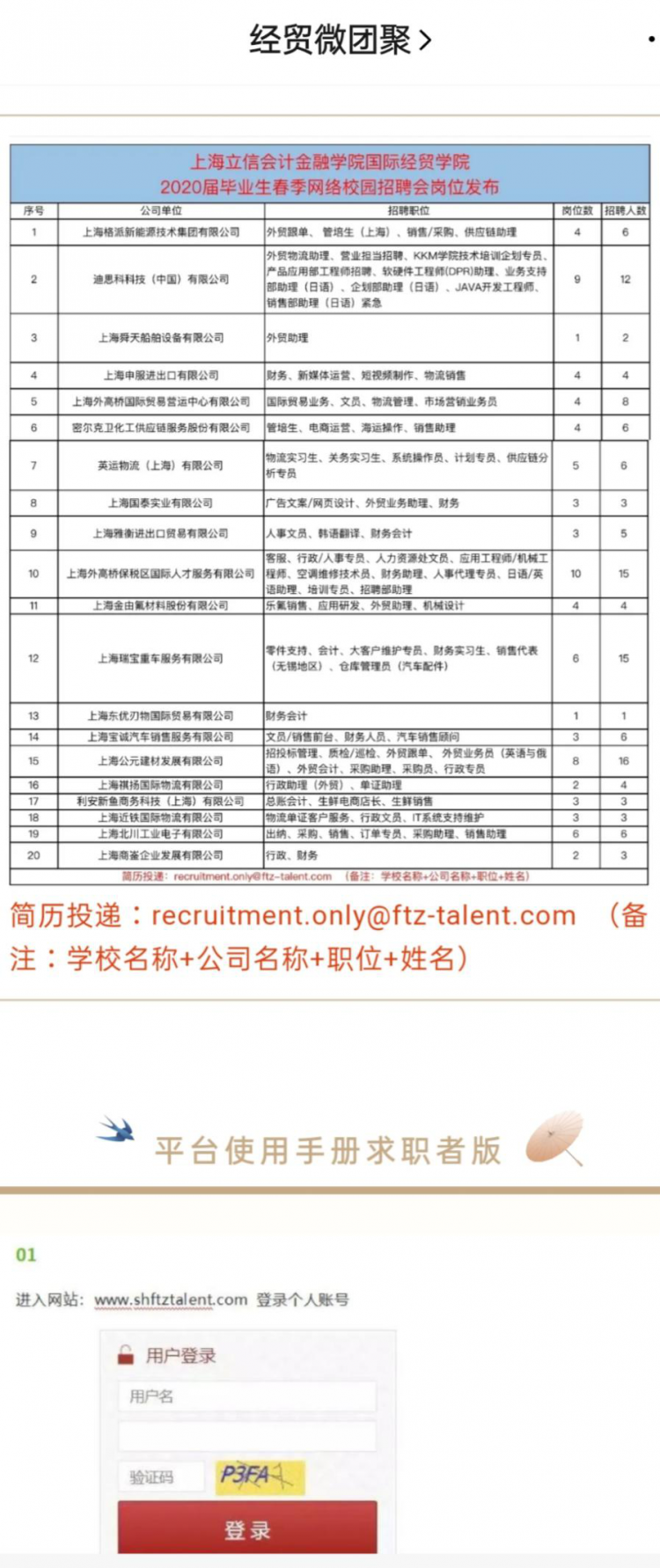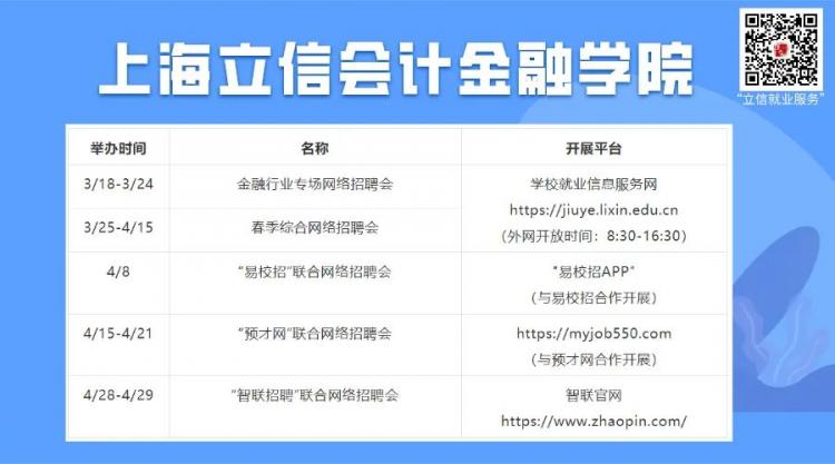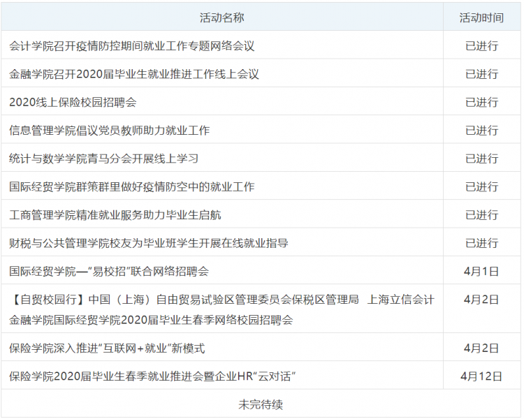 根据国家和上海市的统一部署,在疫情防控期间,为帮助我校毕业生寻找就业岗位,扩宽毕业生就业渠道,帮助用人单位宣传揽才,招生与就业办公室举行了多场专场线上网络招聘会。(更多详细招聘信息,请同学们关注“立信就业服务”官方公众号。)
