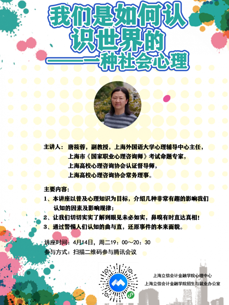 第一场讲座,我们邀请到了上海外国语大学心理辅导中心主任唐筱蓉副教授,为各位同学,尤其是毕业班的同学们带来一场走入社会之前的“心理预热”。