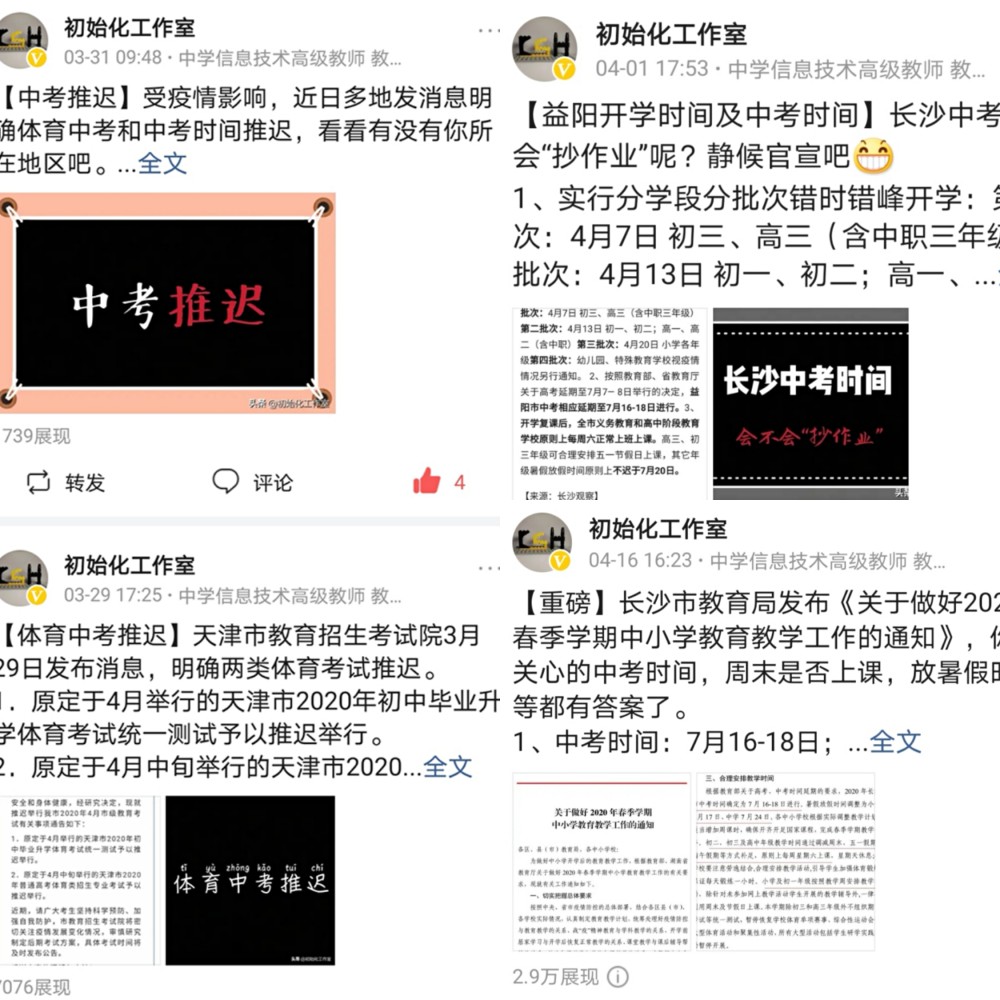 这样重庆、长沙也加入了中考延期的群聊中。大陈印象中最早是3月29日,天津宣布体育中考推迟开始,接着是3月31日,山西、成都宣布中考延期,4月1日湖南益阳宣布中考延期,随后湖南各地州市相继加入中考延期队伍,目前14个地市已经有8个地市宣布延期。4月12日,北京宣布中考延期至7月17日-19日。估计大部分地区2020年中考都会选择延期了,延期的时间一般都是一个月。