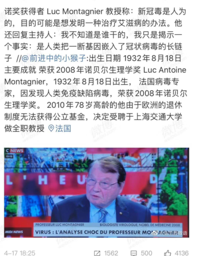 北京时间2020年4月17和18日,有不少中文媒体(和少量英文、法文媒体)报道法国研究艾滋病毒的科学家、2008年诺贝尔生理或医学奖获得者吕克q蒙塔尼耶(Luc Montagnier)