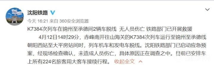 4月12æ—¥14æ—¶29分,赤峰å—开往山海关的K7384次列车è¿è¡Œè‡³é”¦å·è‡³æ‰¿å¾·çº¿æœé˜³è¥¿ç«™è‡³å¤§å¹³æˆ¿ç«™é—´æ—¶ï¼Œåˆ—车机车和å‘电车脱线。沈阳é“路部门已å¯åŠ¨åº”æ€¥é¢„æ¡ˆï¼Œç»ç°åœºæ£€æŸ¥ç¡®è®¤ï¼Œæœªé€ æˆäººå‘˜ä¼¤äº¡ï¼Œå…·ä½“åŸå› æ£åœ¨è°ƒæŸ¥ä¹‹ä¸ã€‚ç›®å‰å·²å®‰æ’车上所有224åæ—…客用大客车æ¥ç»è¡Œç¨‹ã€‚