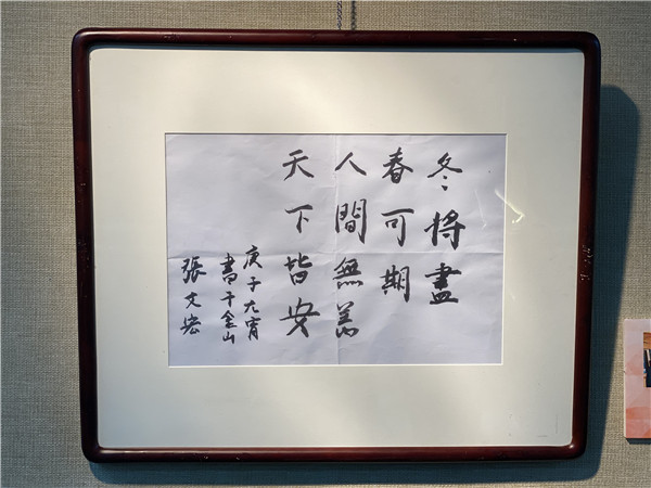 征集过程最为波折的展品是上海市新冠肺炎医疗救治专家组组长、复旦大学附属华山医院感染科主任张文宏的手书寄语。2月初上海图书馆馆长陈超向张文宏发出了书写寄语的邀请。张文宏在上海市公共卫生临床中心抗疫一线工作的休息时间使用住地的便笺书写了寄语,拍照发至上图,当日即在上海图书馆微信公众号上进行了展览,寄语照片被无数次转载。在得知上图即将举办本次展览时,张文宏利用宝贵的休息时间,特地用毛笔和墨汁重新书写了一份捐赠上图。这是上图在布展前收到的最后一份寄语原件。此外,张文宏还捐赠了中国驻美大使崔天凯致其的公开感谢信。