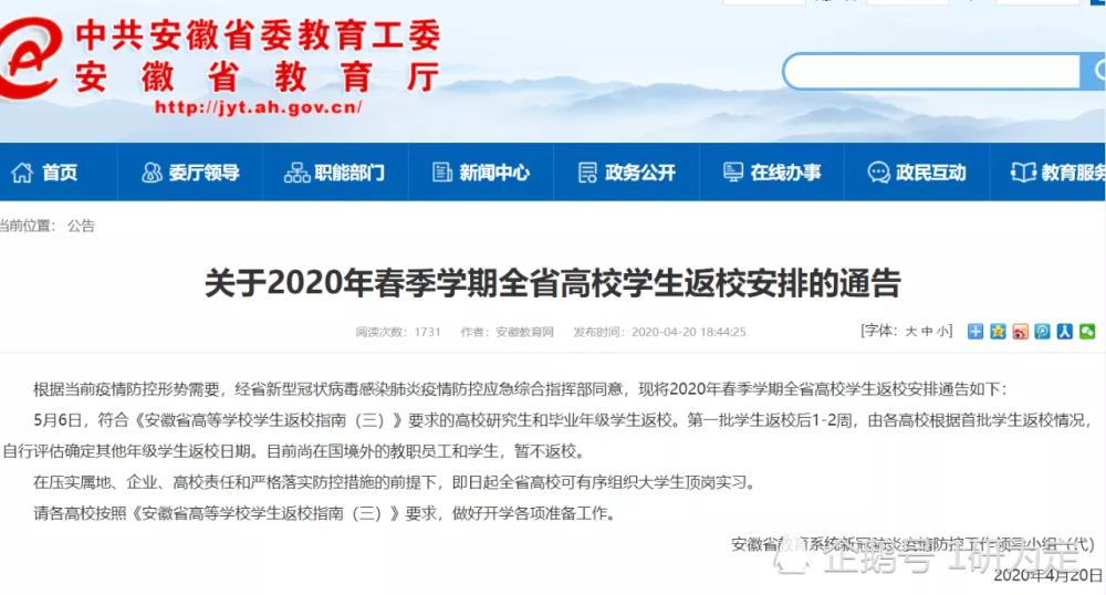 4月20日晚间,安徽省教育厅正式发布《关于2020年春季学期全省高校学生返校安排的通告》,其中提出,5月6日,符合《安徽省高等学校学生返校指南(三)》要求的高校研究生和毕业年级学生返校。第一批学生返校后1-2周,由各高校根据首批学生返校情况,自行评估确定其他年级学生返校日期。目前尚在国境外的教职员工和学生,暂不返校。