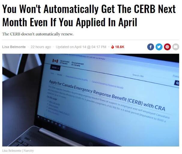 “加拿大紧急救助津贴(CERB)”,每人每月可领取$2000加元(相当于每周发放$500加元),最多为期16周(也就是4个月)。值得注意的是,如果一个月过去仍然满足申请条件的话,需再次提交申请,每隔4周为一个周期,最多申请4次,如果不申请的话,政府是不会自动延续发救助金的。