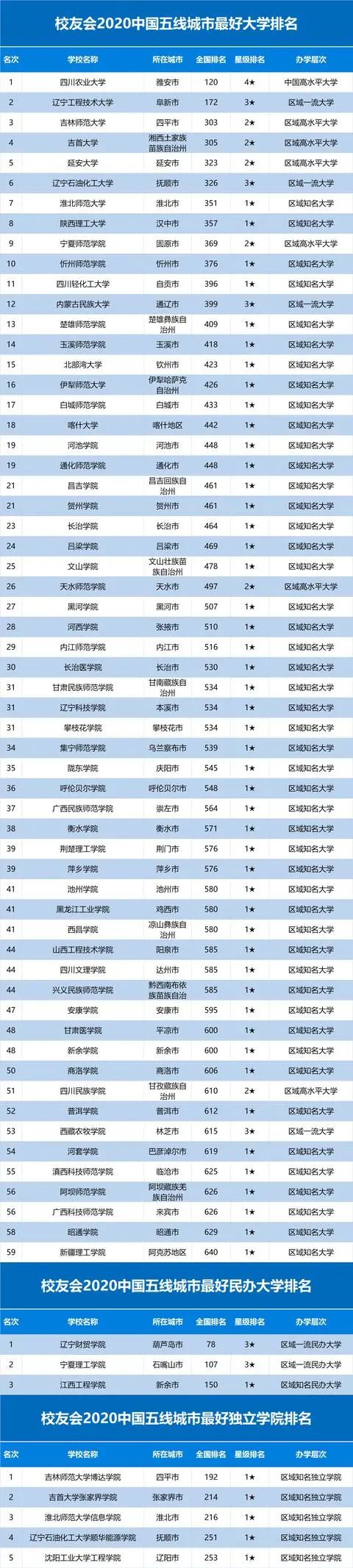 2020中国各线城市最好大学排名。