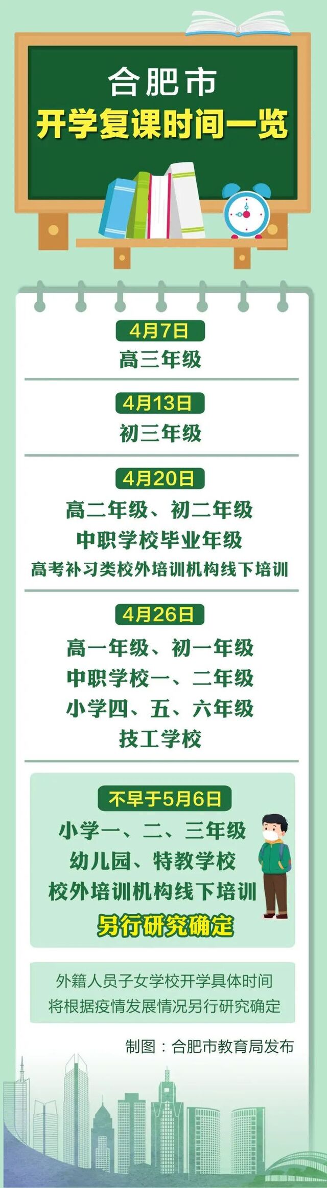 小学一、二、三年级,幼儿园,特教学校开学复课时间及校外培训机构开展线下培训时间另行研究确定,