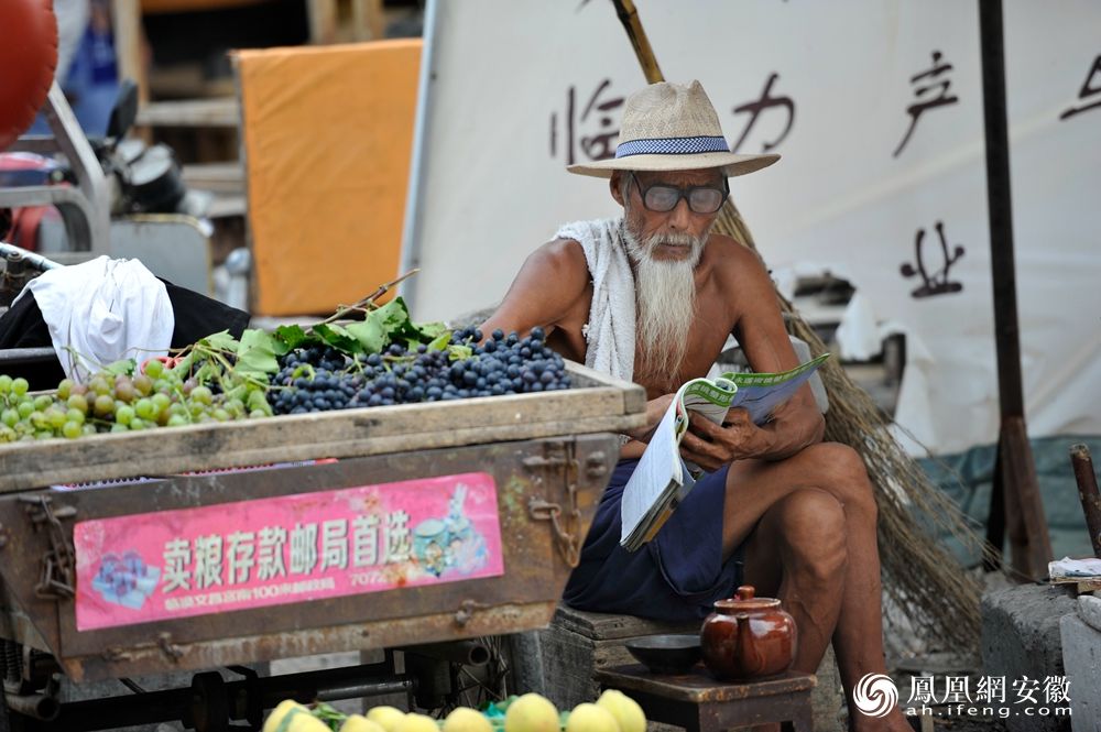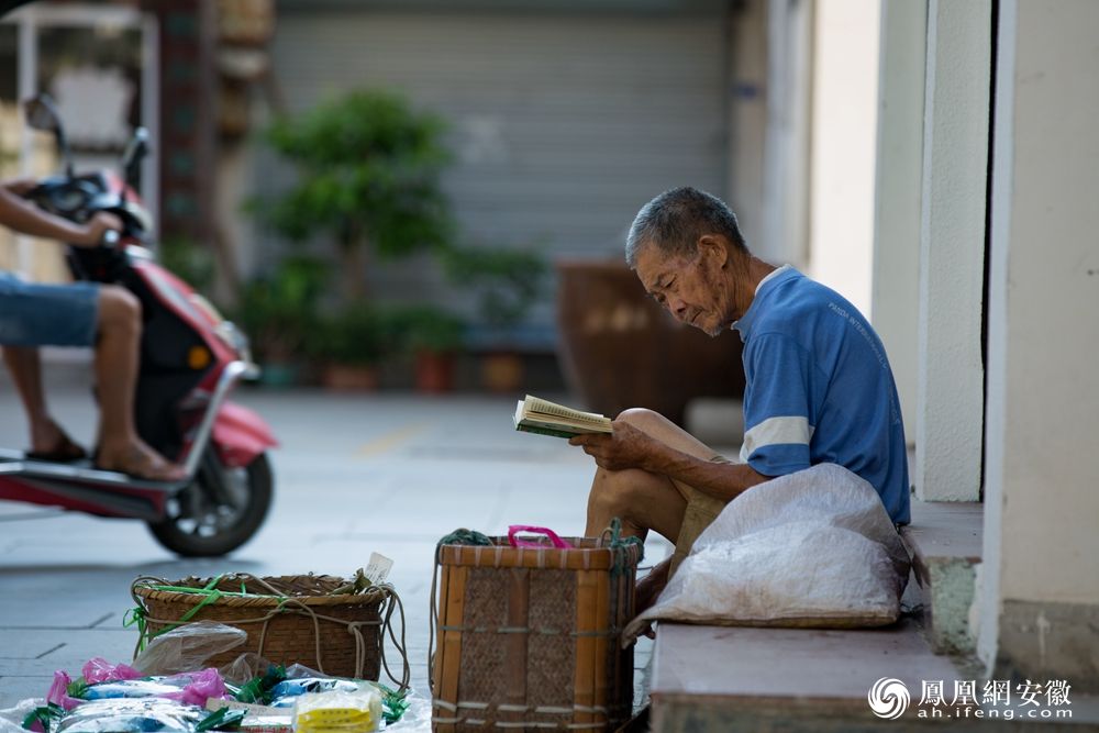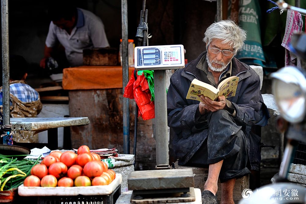 淮北临涣镇上卖菜的老人姓周,阅读是他的喜好,只要有空闲时间他就会阅读。(凤凰网安徽特约摄影师 颜立平/摄)