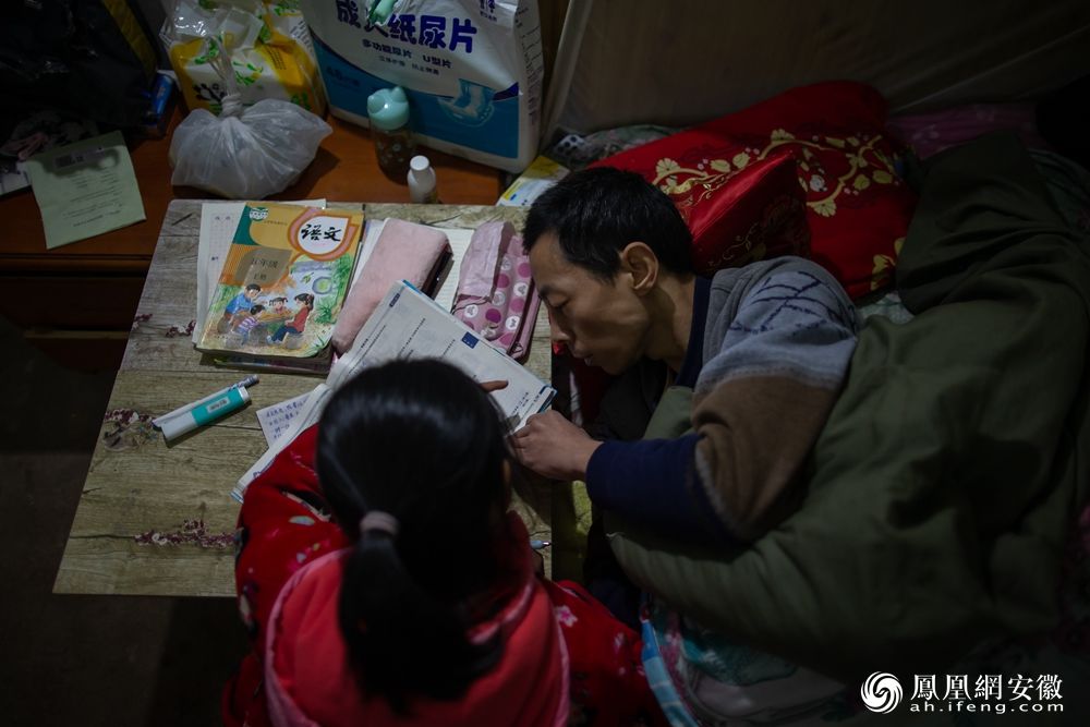 铜陵枞阳,10岁的汪茹鑫在瘫痪在床的父亲汪楹的辅导下完成作业。(凤凰网安徽特约摄影师 黄向华/摄)