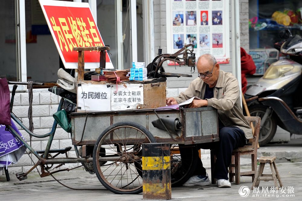 淮北皖河路红鑫小区门口,一位修鞋的老人正在阅读报纸。(凤凰网安徽特约摄影师 颜立平/摄)