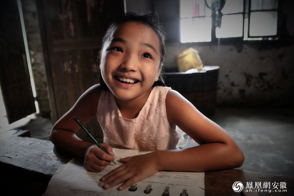 简陋的书桌上,王源源灿烂地笑了,一双眼睛熠熠生辉。(凤凰网安徽特约摄影师 塔影横江/摄)