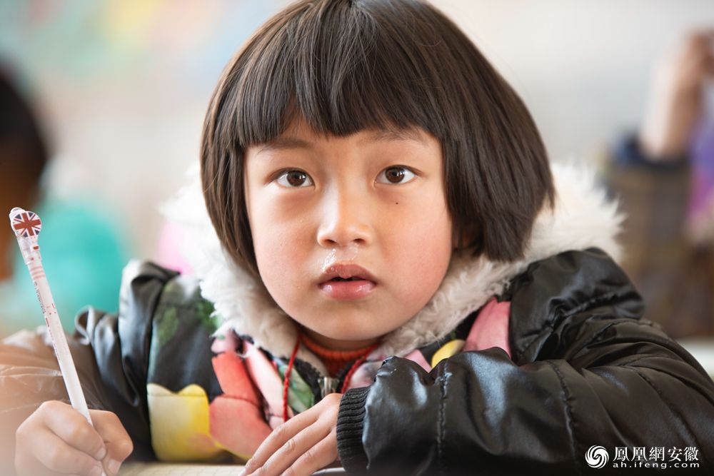 黄山市祁门县古溪乡西源小学课堂上,一位孩子边学习边抬头看向老师。(凤凰网安徽特约摄影师 林坚/摄)