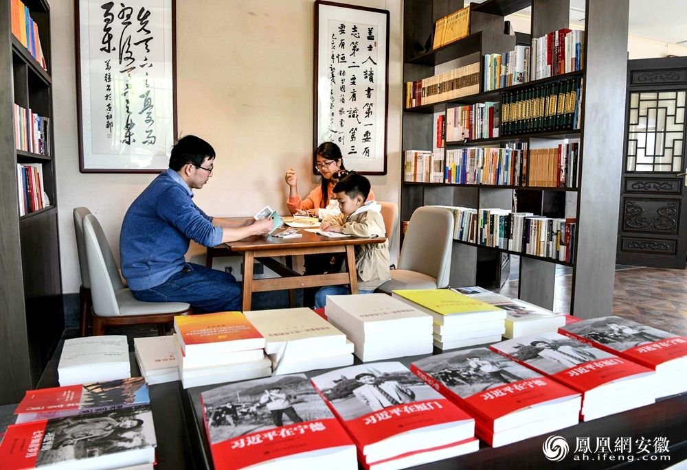 家长带着孩子在安徽省铜陵市天井湖公园天井书院阅读图书。(凤凰网安徽特约摄影师 过仕宁/摄)