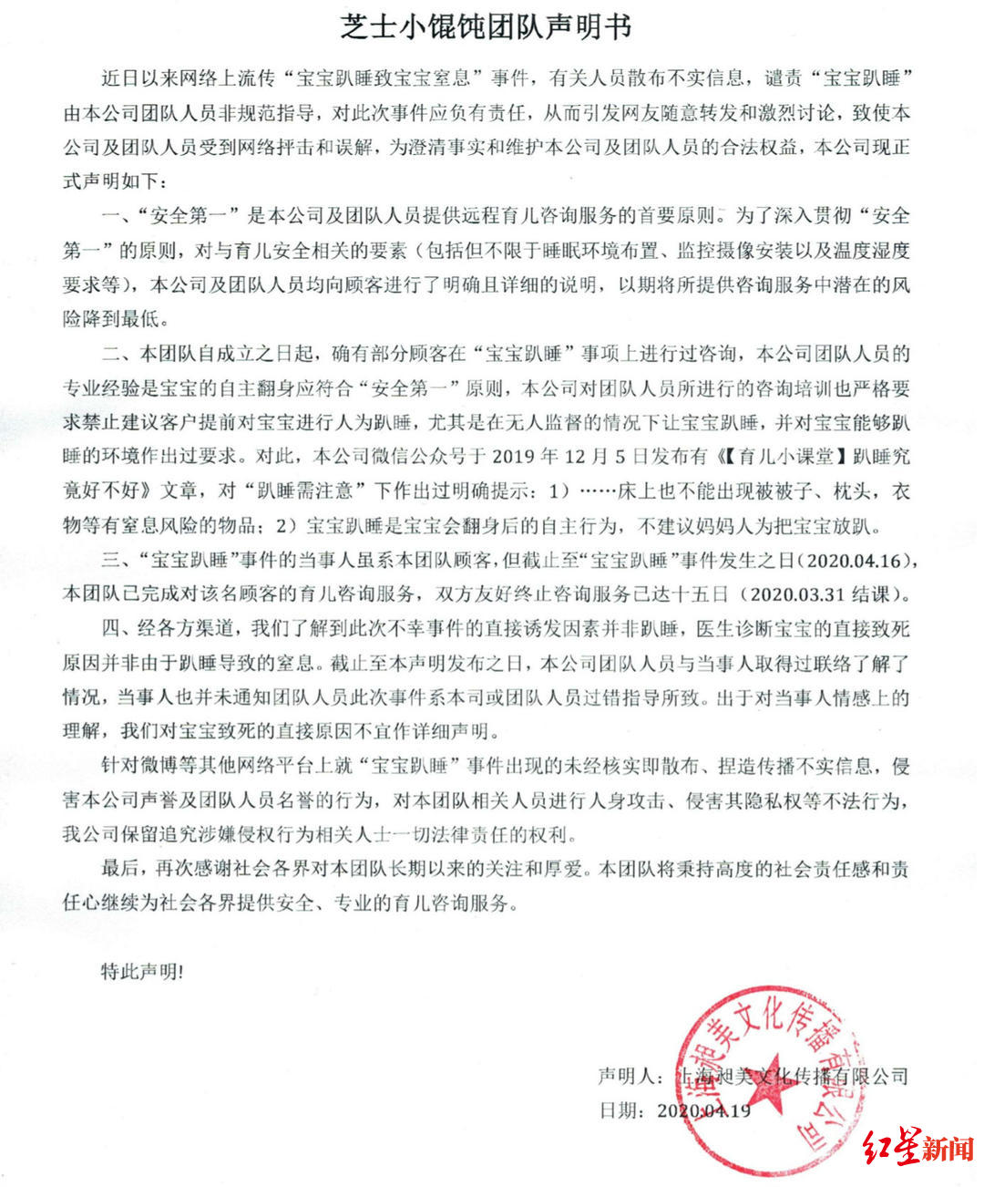 4月19日,涉事机构“芝士小馄饨”在其微博和微信发表声明称,团队对育儿的相关要素和潜在风险对顾客进行了详细说明,“宝宝趴睡”事件当事人3月31日结课后,4月16日事件发生;团队已与当事人取得联系,经医生诊断,宝宝直接致死的原因不是趴睡导致的窒息,当事人未通知团队事件系团队人员过错指导所致。