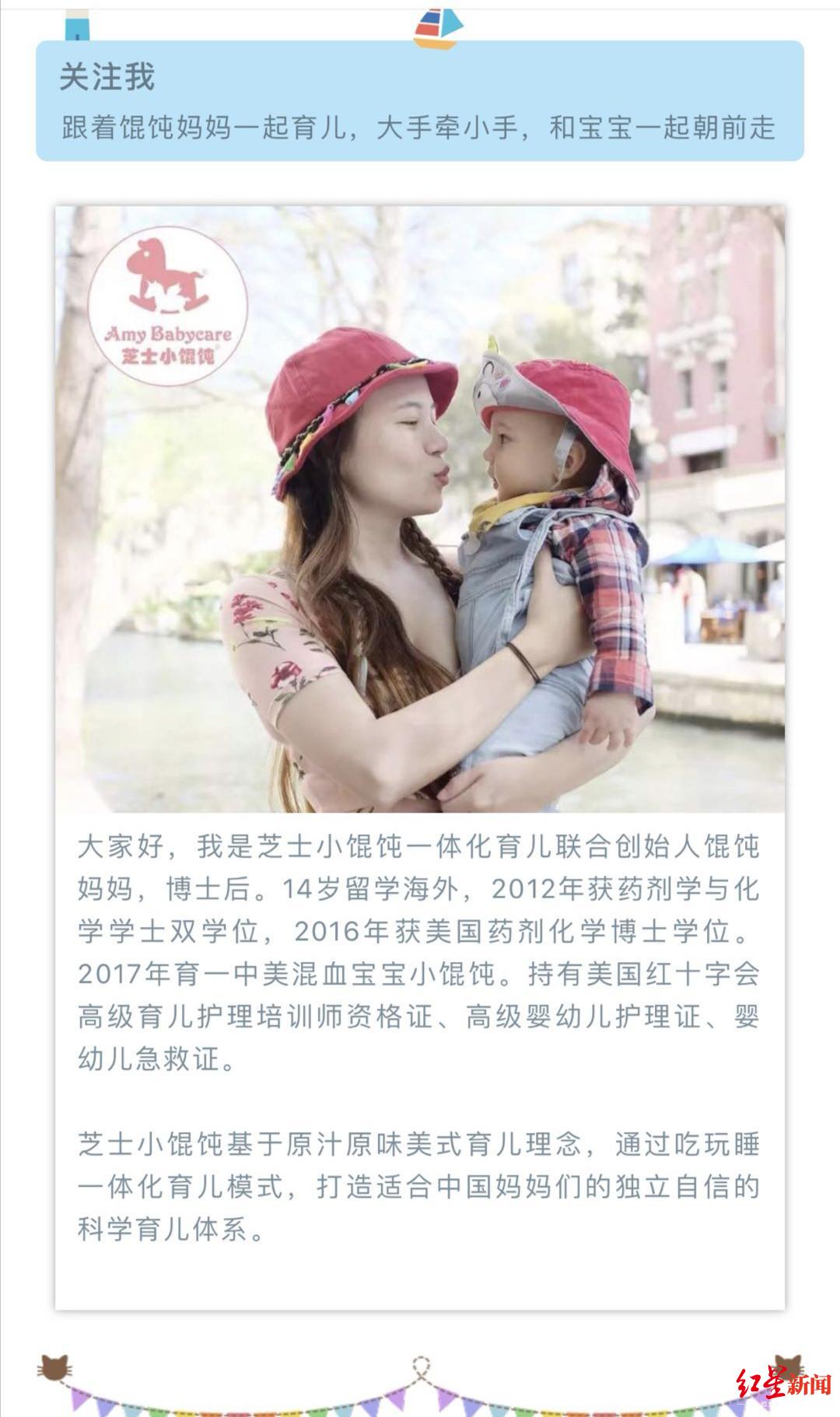 公众号内容显示,馄饨妈妈为:博士后,芝士小馄饨联合创始人,持有美国红十字会指导培训资格证等证书。2017年与2019年分别生育中美混血宝宝小馄饨和小芝士。团队成员中,还包括“狗子”妈妈、“谦谦”妈妈等6名育儿师。有购买过课程的家长质疑,团队所谓的育儿师可能并没有资质。