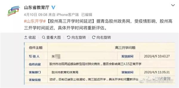 据@山东省教育厅此前消息,受疫情影响,山东胶州高三开学时间延迟,具体开学时间将重新评估。此前,山东省教育厅曾宣布,全省高中(含中职)学校毕业年级4月15日正式开学。