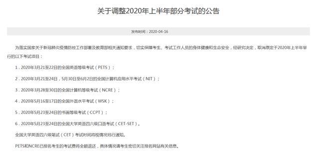 为落实国家关于新冠肺炎疫情防控工作部署及教育部相关通知要求,切实保障考生、考试工作人员的身体健康和生命安全,经研究决定,取消原定于2020年上半年举行的以下考试项目: