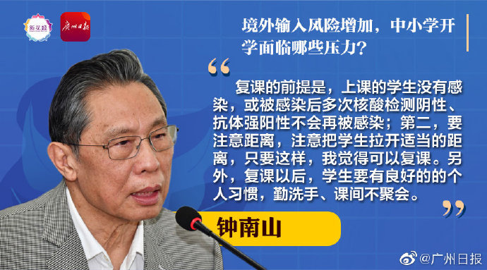 记者提问:在境外输入风险增加的情况下,下月即将开始的中小学开学将面临哪些压力?钟南山:复课核心是学生的聚集,意味着近距离接触。有两点很重要,一是上课的学生应该是没有感染,或者被感染后多次核酸检测是阴性、抗体强阳性不会再被感染。第二,我们需要注意距离,是不是还要这么密集?有些学校条件比较差,要注意把学生拉开适当的距离,只要这样,我觉得可以复课。我不觉得一定要等新增病例为零多少周后才复课,因为现阶段都不可能,偶发病例不奇怪。另外,复课以后,学生要有良好的的个人习惯,勤洗手、课间不聚会。学生家长也很重要,要看学生家长是否有可能被感染,比如跟患者有密切接触、家里曾经有病人等情况。