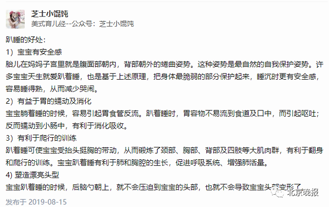 另据美国儿科学会介绍:6个月以前的宝宝严禁趴着睡!因为较小的婴儿对于自己身体的控制能力还很弱,如果趴睡,宝宝很可能不会转动头部以确保自己的呼吸畅顺,也容易出现因口鼻被遮挡而窒息的情况,甚至造成婴儿猝死综合征(SIDS)的发生。