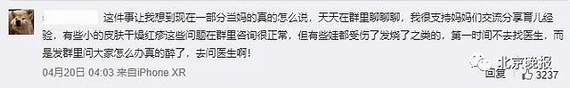 有网友说:“支持妈妈们交流分享育儿经验,有些皮肤干燥红疹这些问题在群里咨询很正常,但有些娃都受伤了、发烧了之类的,第一时间不去找医生,而是发群里问大家怎么办真的醉了,去问医生啊!”