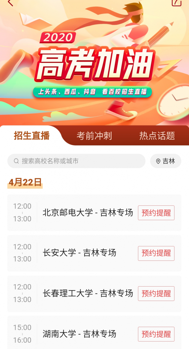 进入专区后,用户可以搜索自己感兴趣的高校名称或城市,在相关学校前面看到直播时间,如果担心错过还可以提前进行预约。