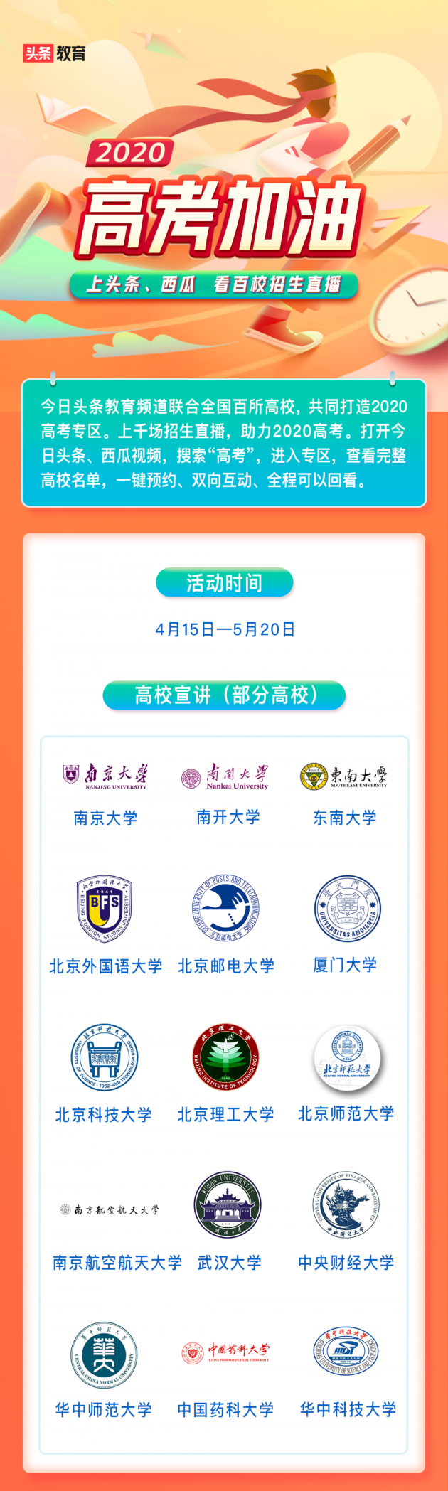 4月20日 - 5月20日期间,打开今日头条或西瓜视频App搜索“高考” - 进入“2020高考百校直播”专区,不仅可以看到上百所高校的招生直播,还可以与高校老师互动,免费观看各科目考点及习题分析。