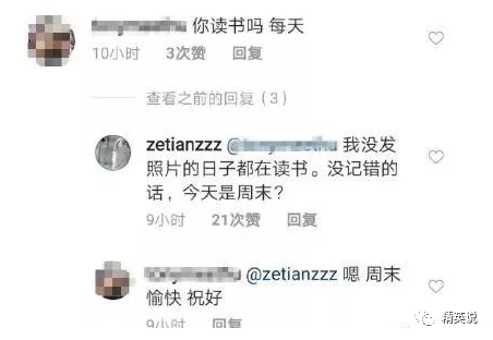 章泽天在这条评论下回复对方: “我没发照片的日子都在读书。 没记错的话,今天是周末? ”