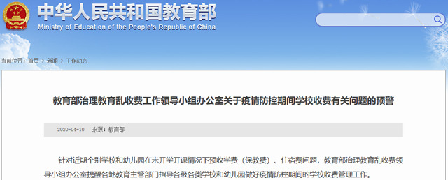 针对近期个别学校和幼儿园在未开学开课情况下预收学费(保教费)、住宿费问题,教育部治理教育乱收费领导小组办公室提醒各地教育主管部门指导各级各类学校和幼儿园做好疫情防控期间的学校收费管理工作。