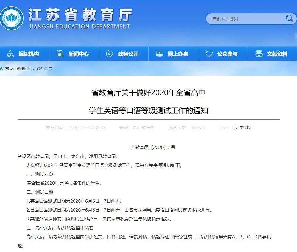 近日,江苏省教育厅发布通知,全省高中学生英语等口语等级测试定在6月举行,测试对象为符合江苏省2020年高考报名条件的学生。