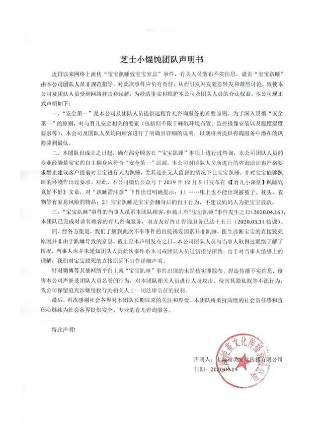 涉事的“芝士小馄饨”是一家“为孩子提供睡眠引导”的付费咨询机构,其在4月19日发布的声明,证实了有参加过课程的婴儿死亡。但该机构称事发时已完成对顾客的育儿咨询服务,且否认孩子的死亡原因是趴睡引起的窒息。