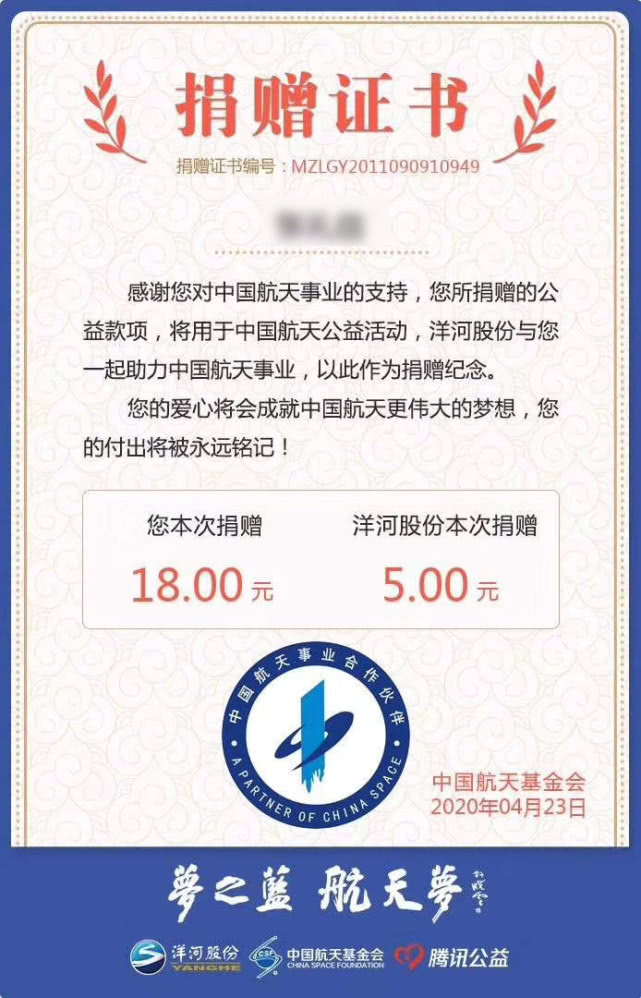 感谢您对中国航天事业的支持,您所捐赠的公益款项,将用于中国航天公益活动,洋河股份与您一起助力中国航天事业,以此作为捐赠纪念。近日,来自江苏泰州的一位消费者在微信朋友圈晒出了自己的航天捐赠证书,成为了梦之蓝百万航天合伙人计划的一员。