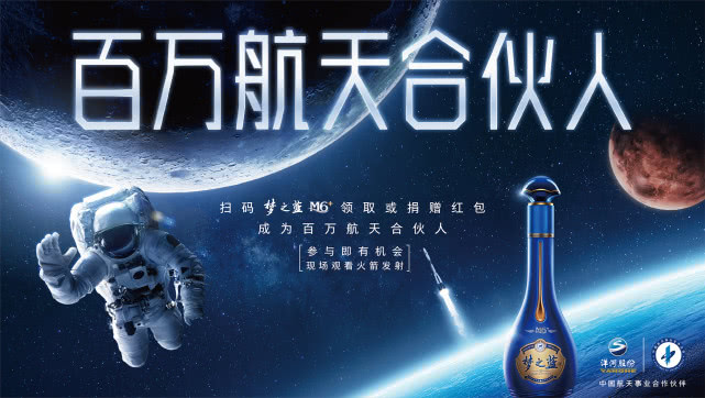 引人关注的是,梦之蓝公益发起的百万航天合伙人计划实现了从增强传播到融合消费场景的转变,让每一瓶梦之蓝M6+都连着消费者的航天梦,让每个消费者都能以合伙人的身份深度参与其中,这无疑是一种全新的航天公益场景构建。